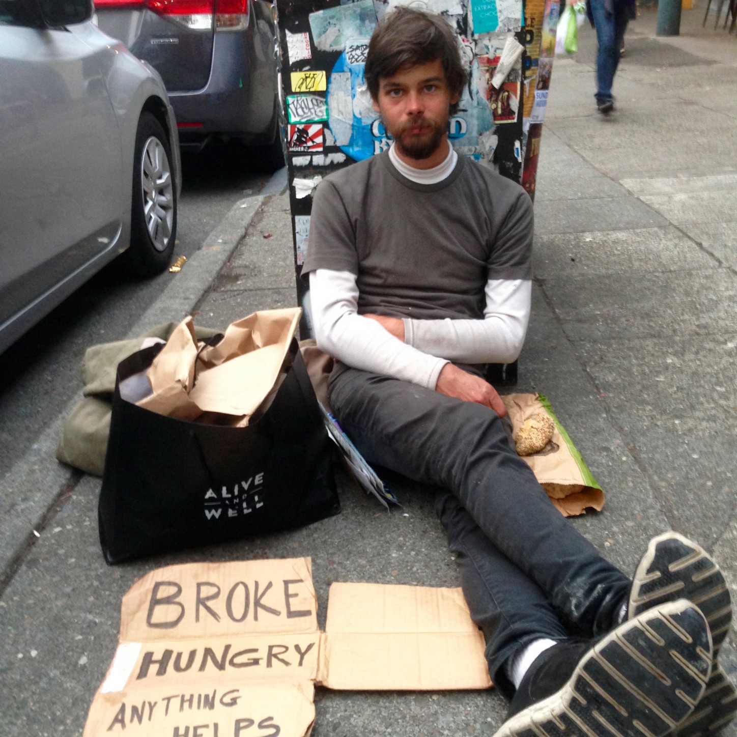As I walk around my neighborhood I am continually confronted by people asking for money for food, for booze, and for “weed.” Many of them are young and in small groups (their own support networks); often with canine companions. For many years I lived in cities with car cultures, hence my exposure to such people had been kept to a minimum. When I first arrived in Seattle I told myself that I would give a dollar to anyone who asked me for money. But I hadn’t realized the sheer numbers of people who are on most of the blocks in the business district so soon abandoned my plan as it would have been unsustainable, given my own financial situation.